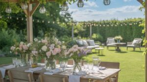 The season you’re hosting in shapes your choices, too. Spring’s fresh blooms offer natural color pops, making a fairy-tale setup with florals practical and pretty. Summer allows for brighter, more eclectic decor—think vibrant bohemian scarves and cushions. Fall, with its deeper tones and cooler air, leans toward cozy vintage accents like wooden crates, candles, or warm-toned ribbons. Your garden’s natural features also play a role. A large, open lawn invites sprawling comfort; a shaded nook might become a secluded fairy-tale corner.