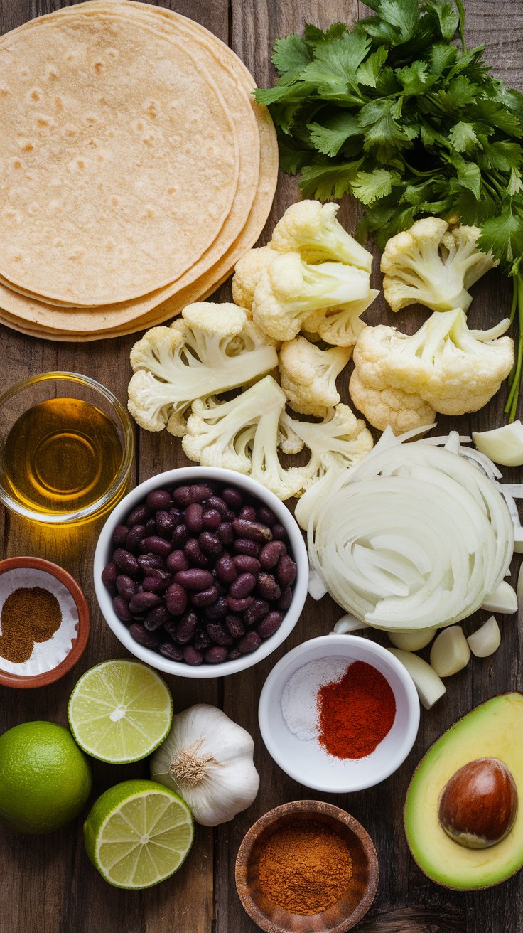 In a mixing bowl, combine roasted cauliflower, drained black beans, diced onion, minced garlic, lime juice, and chopped cilantro. Adjust seasoning as needed.