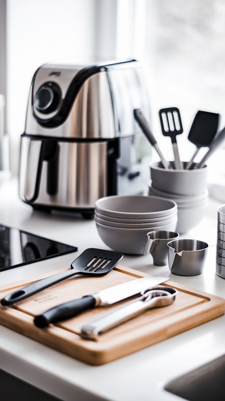 - Knife and cutting board are necessary for chopping vegetables for the bean mixture in the vegan taquitos.
