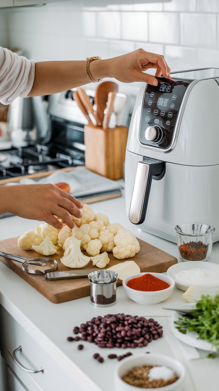 Preheat your air fryer to 400°F. Meanwhile, toss cauliflower florets with olive oil, cumin, smoked paprika, salt, and pepper before adding them to the filling for the vegan taquitos. Roast in the air fryer for about 15 minutes until lightly browned.